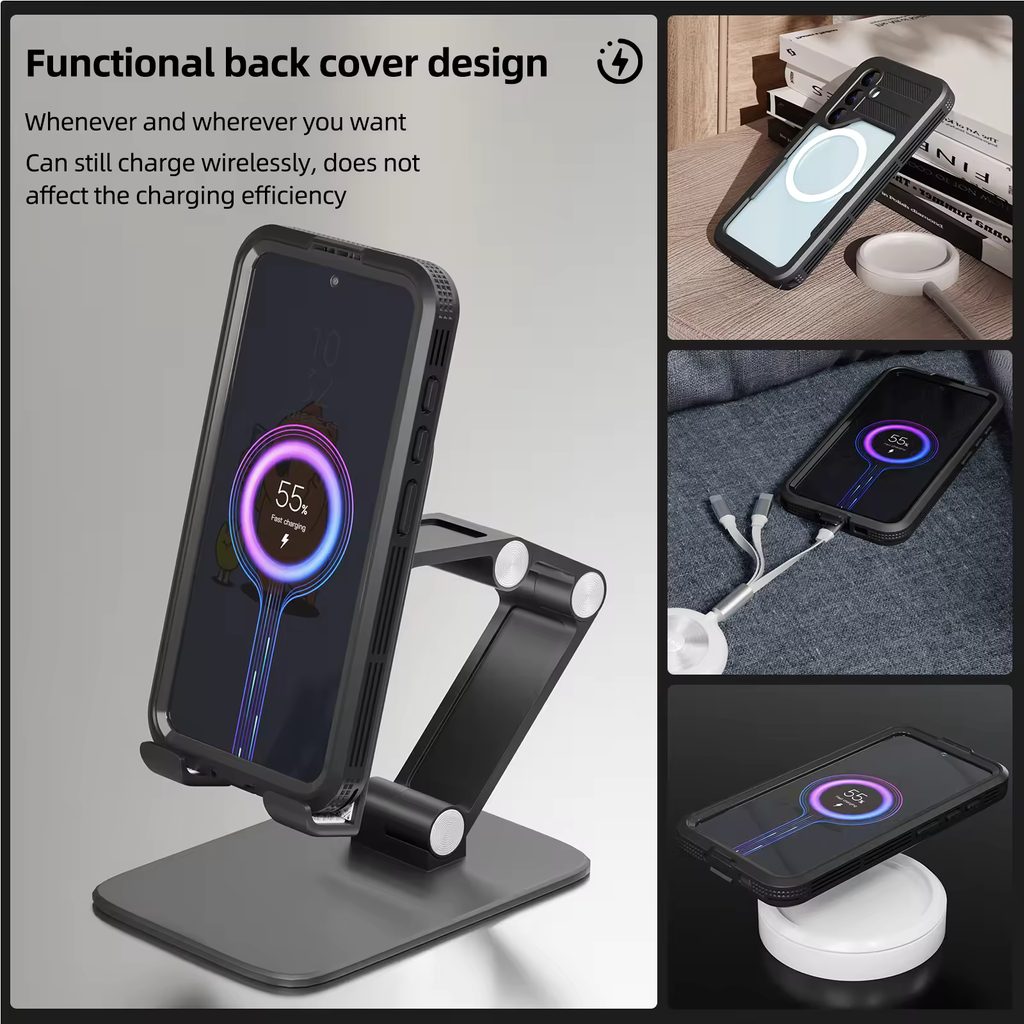 De waterdichte ShellBox hoes met IP68-bescherming is een extreem robuust product. Het frame dat de achterkant en randen van het apparaat omsluit, is gemaakt van een mix van zacht thermoplast en een geharde polycarbonaat coating. Dankzij de textuur van het frame ligt de telefoon veilig in de hand en het geïntegreerde glas beschermt het scherm van de telefoon extra.