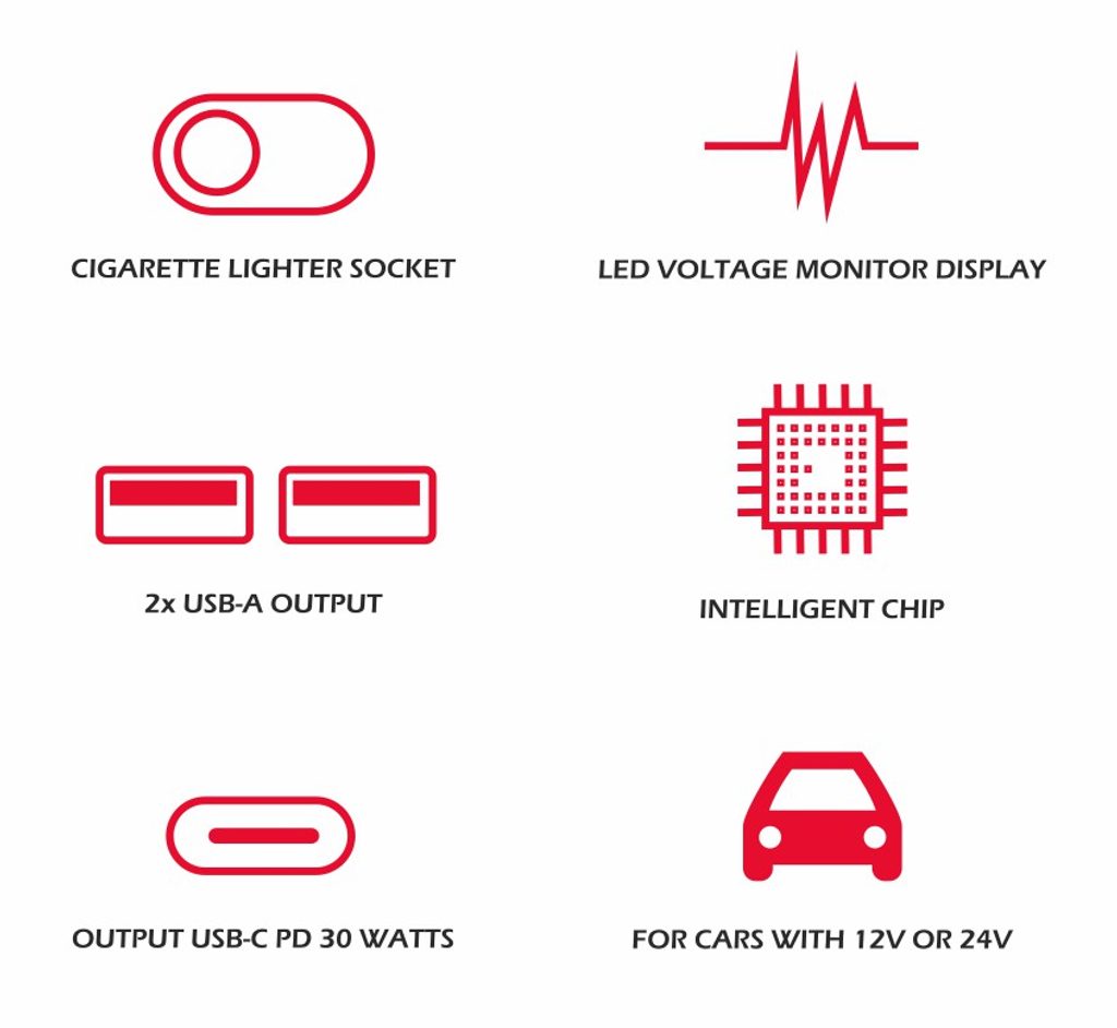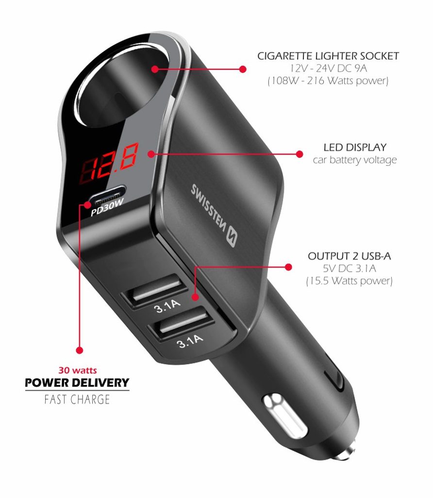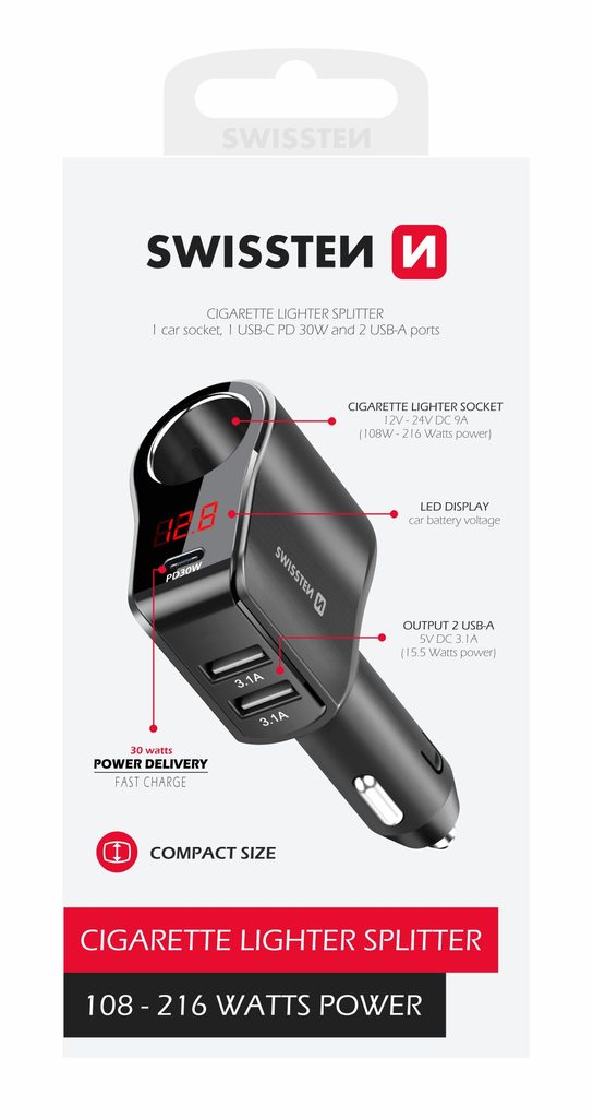 Hoogwaardige CL-adapter voor sigarettenaansteker met uitgangen 1xCL, 1xUSB-C PD, 2xUSB-A. Verpakt in Swissten blister.